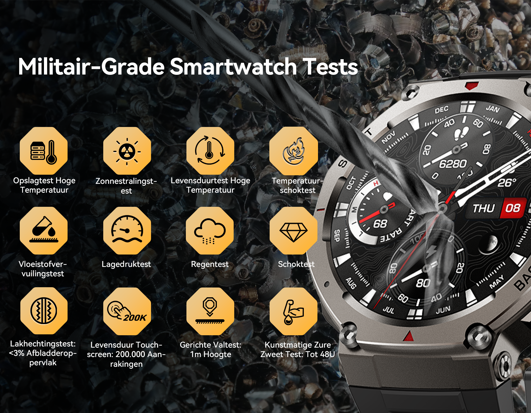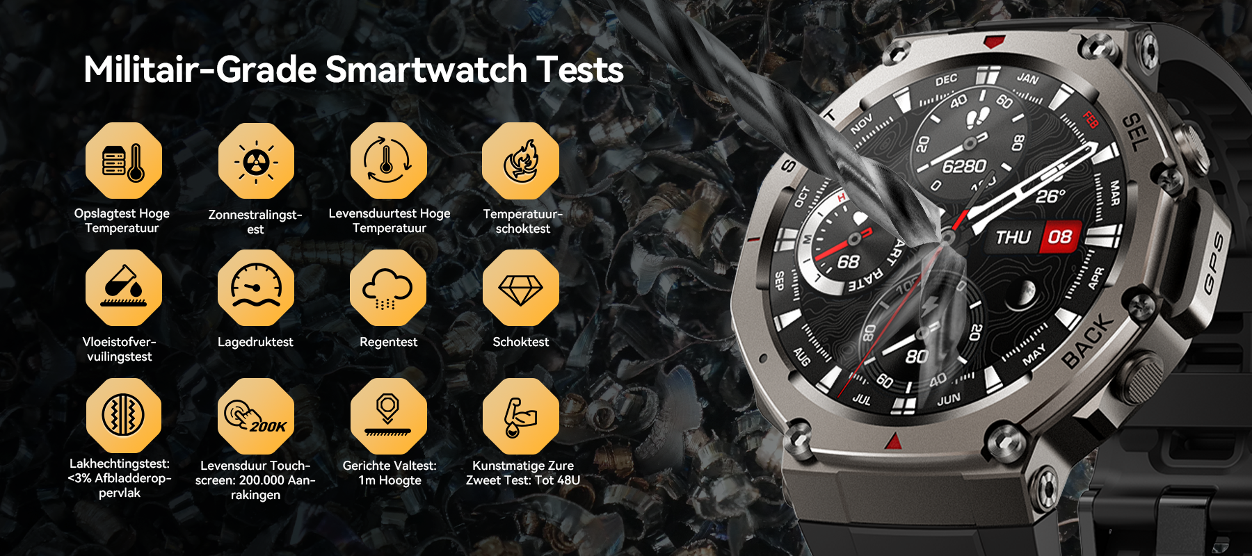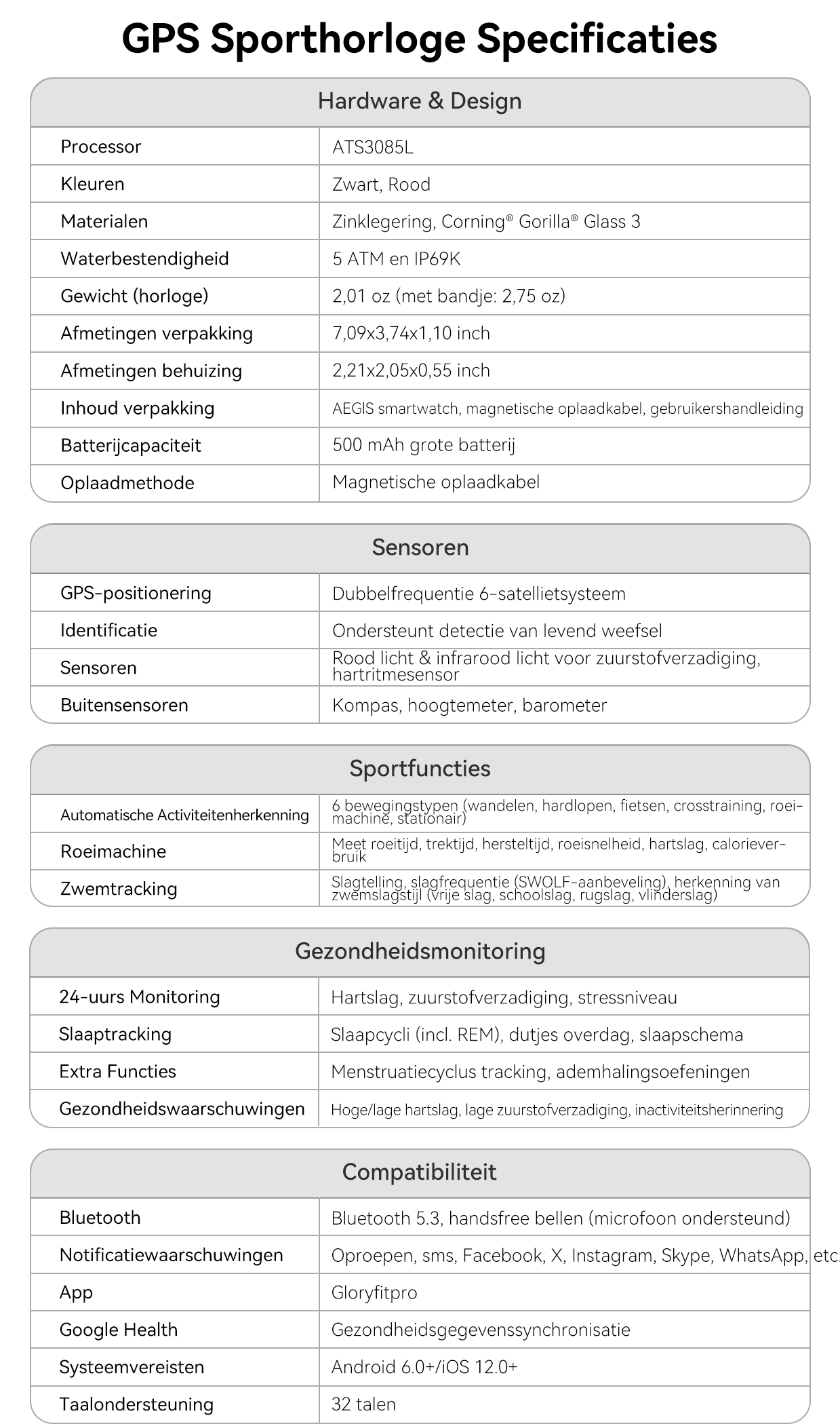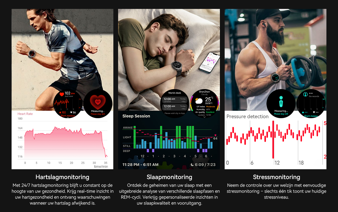 - 24/7 Health Guardian- Realtime monitoring van hartslag, bloedzuurstof en stress voor veiligheidswaarschuwingen.