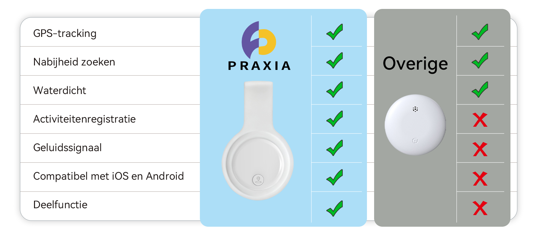 En zo werd Praxia geboren. Dit compacte, lichtgewicht apparaat kan eenvoudig aan een rugzak worden bevestigd, in een zak worden gestoken of in een koffer worden geplaatst, waardoor bescherming moeiteloos wordt. Praxia doet een simpele belofte: om je voortdurend verbonden te houden met je familie en waardevolle spullen, zodat je je zorgen kunt verlichten en je gemoedsrust kunt behouden.